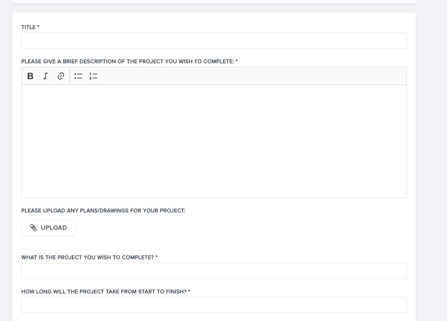 Fill in the data for the request. Including type of improvement being requested, the signed and completed ARC form, a plat map with the location and size of the requested improvement, and any supporting attachments that would be useful for your associations board members to see.