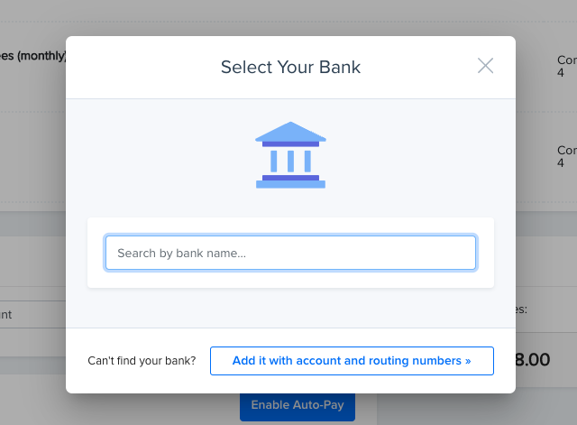 Bank accounts require verification of ownership before processing payments. You can verify your account instantly using your online banking credentials. Or you can add a bank account using the account and routing numbers. To do this, click "Add it with account and routing numbers," referenced in the image below. (Using your account and routing number requires micro-deposit verification, which takes 1-2 business days to authorize before use.)