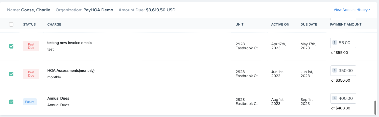 Select the charges you want to pay. (Amounts of each selected charge can also be modified using the text field by payment amount)